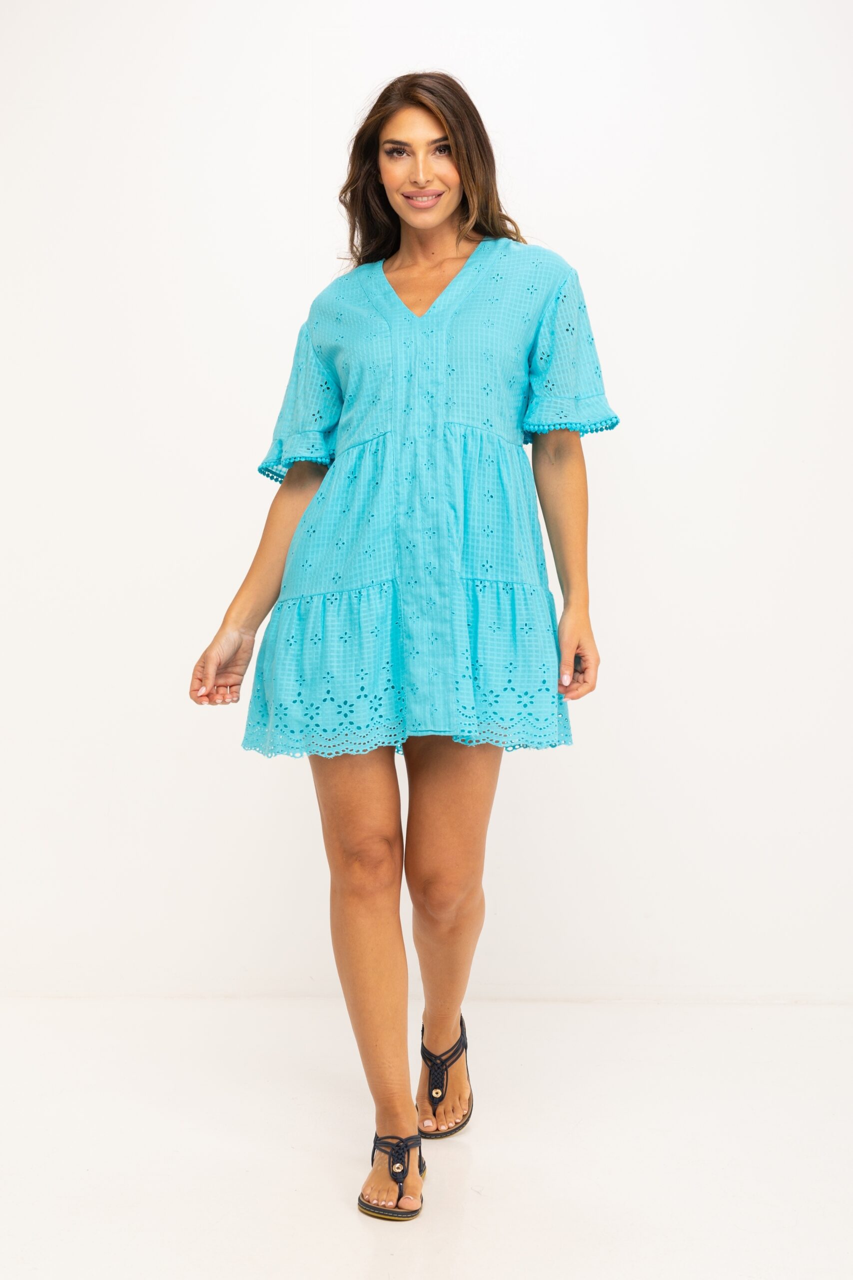 VESTIDO LISO, BONITO TEJIDO ENTRAMADO CON BORDADOS Y CALADOS, CON FORRO INTERIOR, MANGA CORTA, CUELLO EN V, CORTES HORIZONTALES EN CINTURA Y CADERA, Y SIMULACION A TAPETA FRONTAL DESDE EL CUELLO AL BAJO