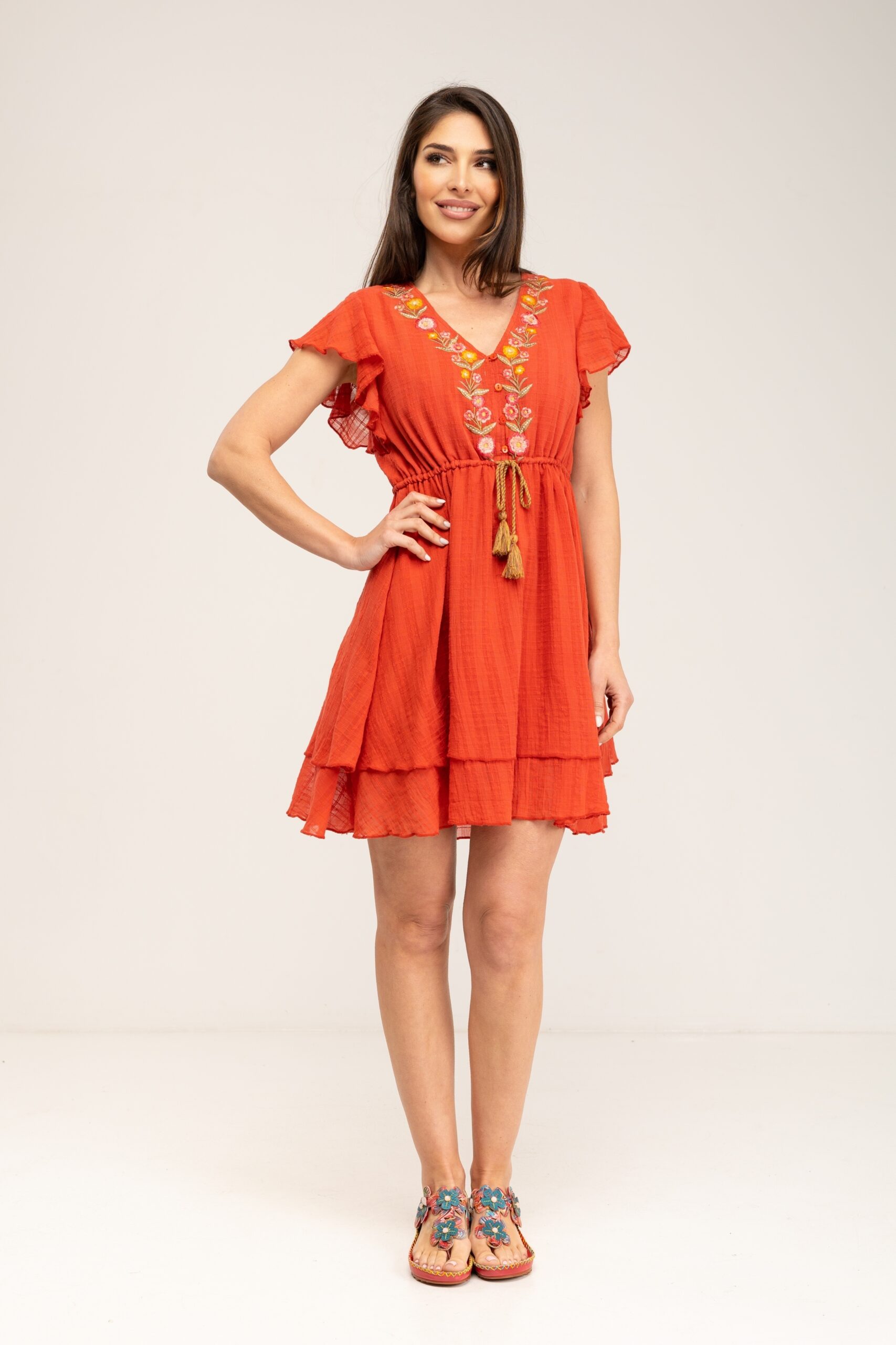 VESTIDO LISO CON BORDADOS MANUALES DE TELA RUSTICA