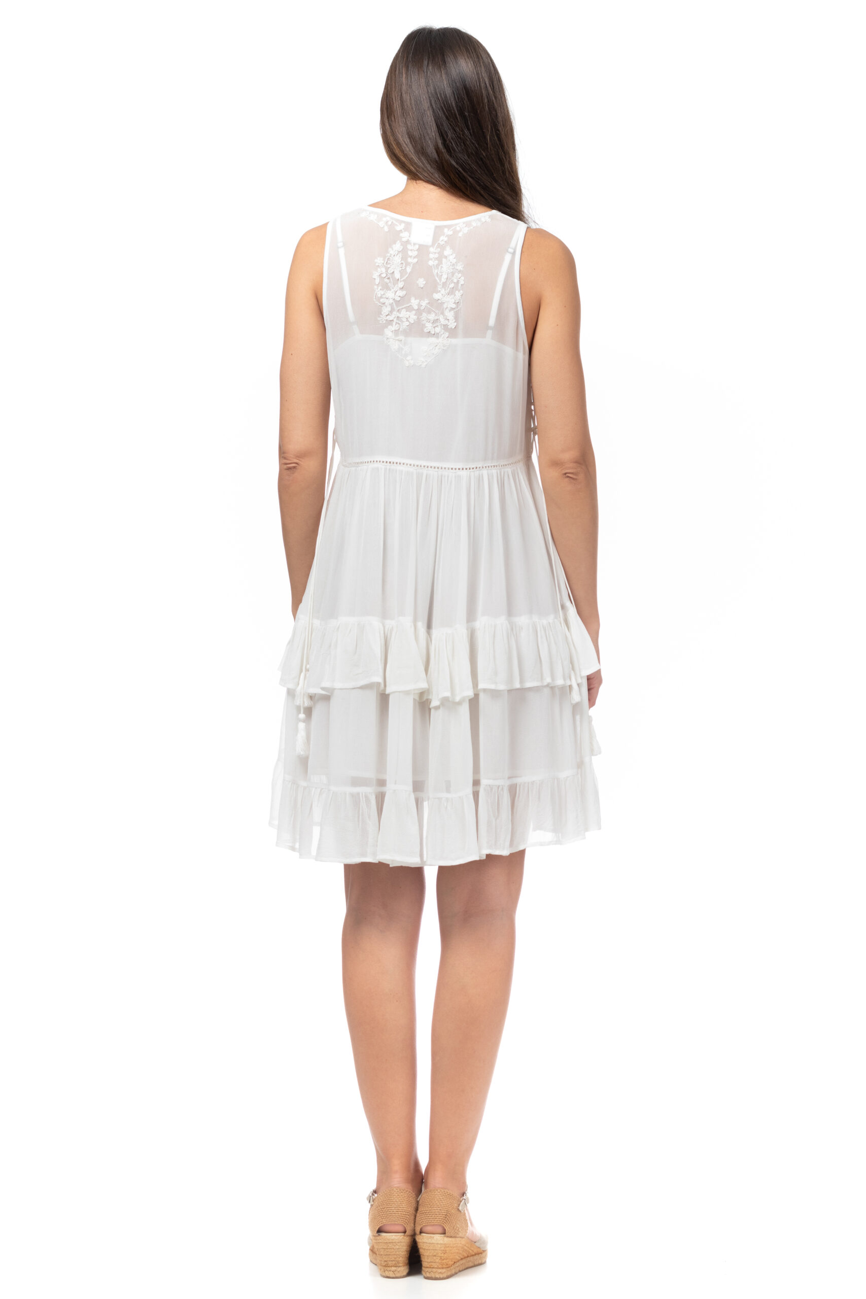 VESTIDO LISO CON VOLANTES AJUSTABLE CON CORDONES EN LOS LATERALES BORDADOS EN EL PECHO Y EN LA ESPALDA