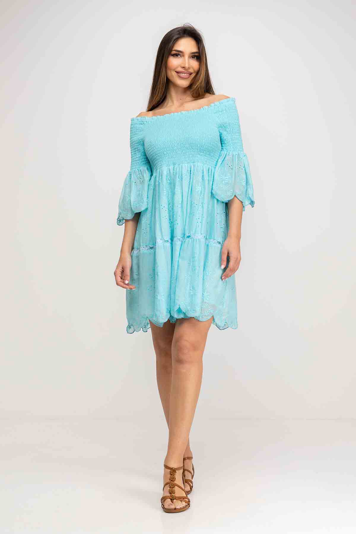 VESTIDO LISO CUELLO CAJA, PARTE SUPERIOR Y LA MITAD DE LA MANGA EN NIDO DE ABEJA, RESTO DE LA MANGA Y FALDA EN TEJIDO LISO CON BORDADOS Y CALADOS, CORTE BAJO EL PECHO DANDO VUELO A LA FALDA, TIRA DE LACE EN MITAD DE LA MISMA Y BAJO ACABADO EN OVERLOCK 100% ALGODÓN