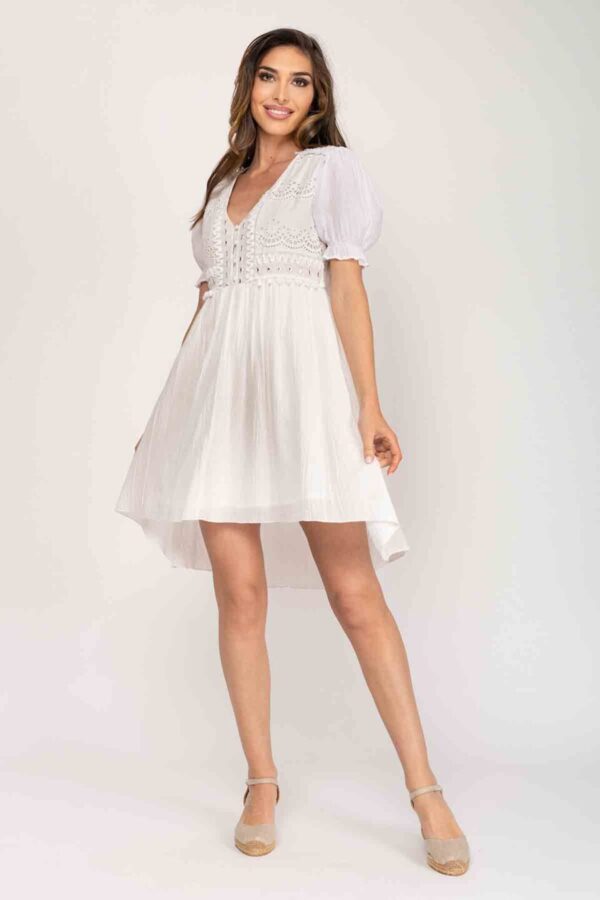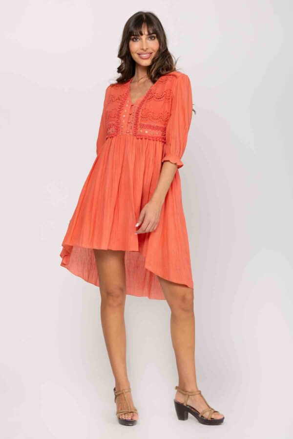 VESTIDO LISO DIFERENTES LARGOS CON MANGA AL CODO, CUELLO EN V , BOTONES HASTA CINTURA, TRABAJO ARTESANAL EN ZONA DEL PECHO CON BORDADOS, BORLAS Y ESPEJOS. CORTE BAJO EL PECHO Y FALDA CON VUELO