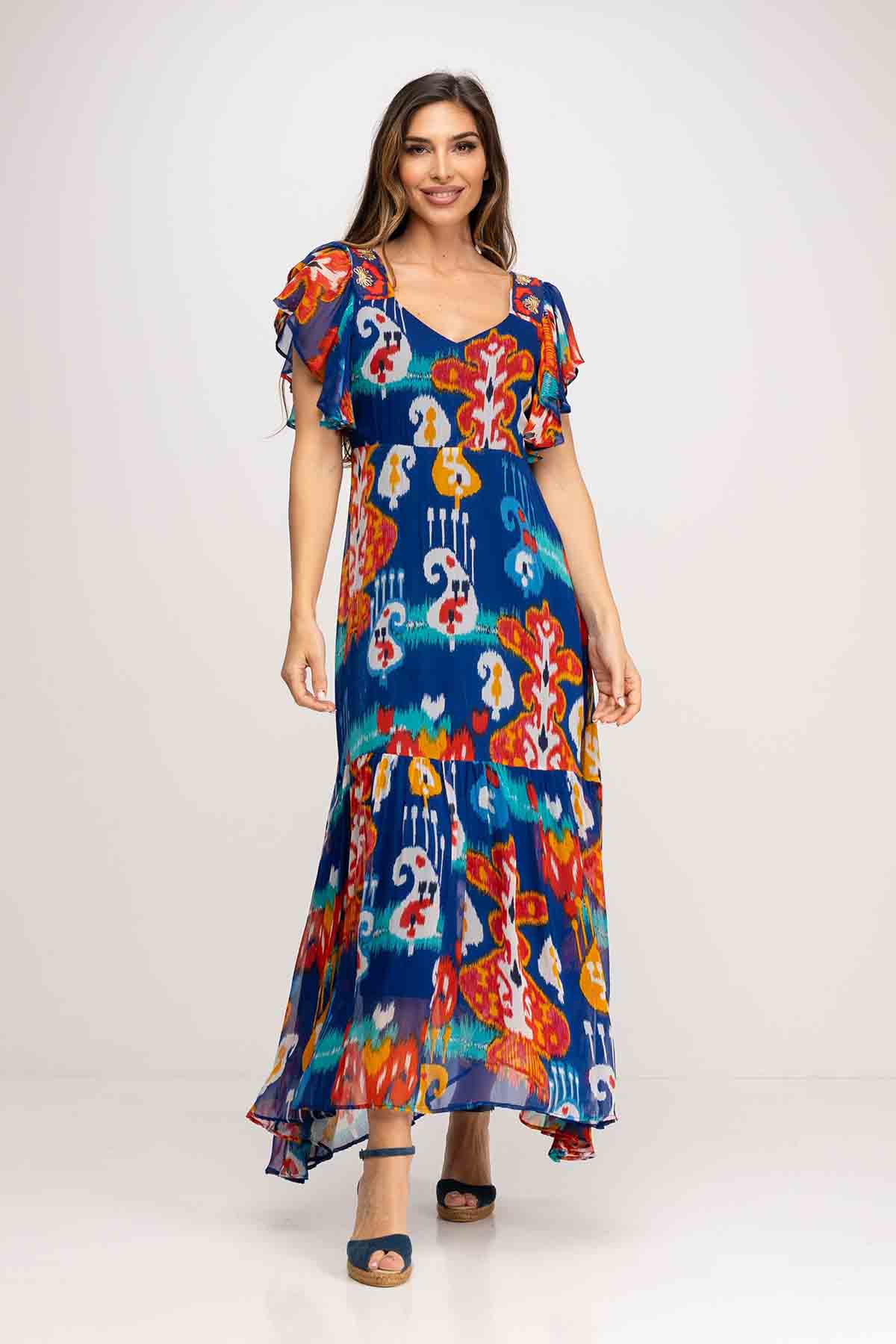 VESTIDO MIDI ESTAMPADO ESPECIAL FLUIDO, MANGA CORTA DE VOLANTES, ESPALDA CON ESCOTE PICO Y CINTURON DE LAZADA