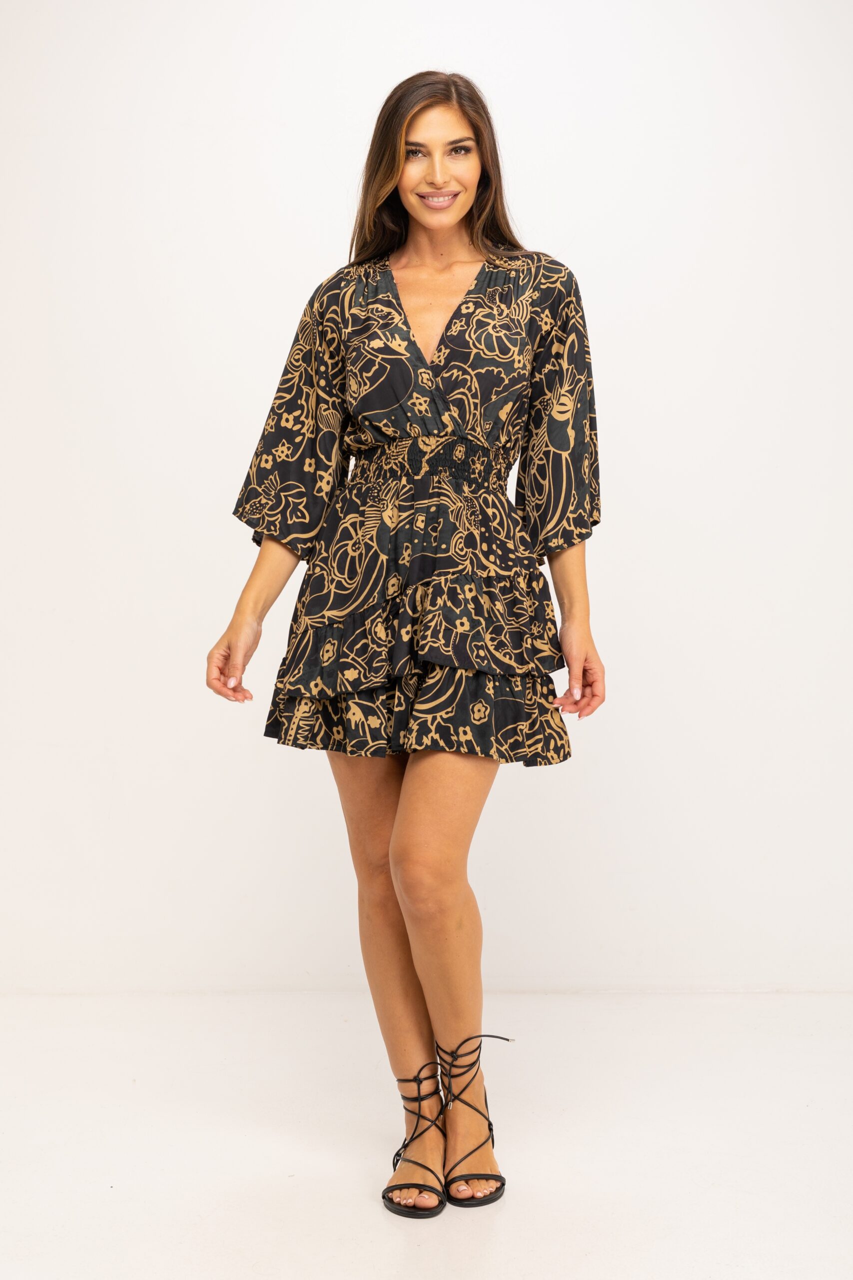 VESTIDO MINI ESTAMPADO CON MANGA 3/4 MUY AMPLIA, CUELLO CRUZADO , CORTE BAJO PECHO Y CINTURA ENGOMADA PARA MEJOR AJUSTE, VOLANTES EN BAJO