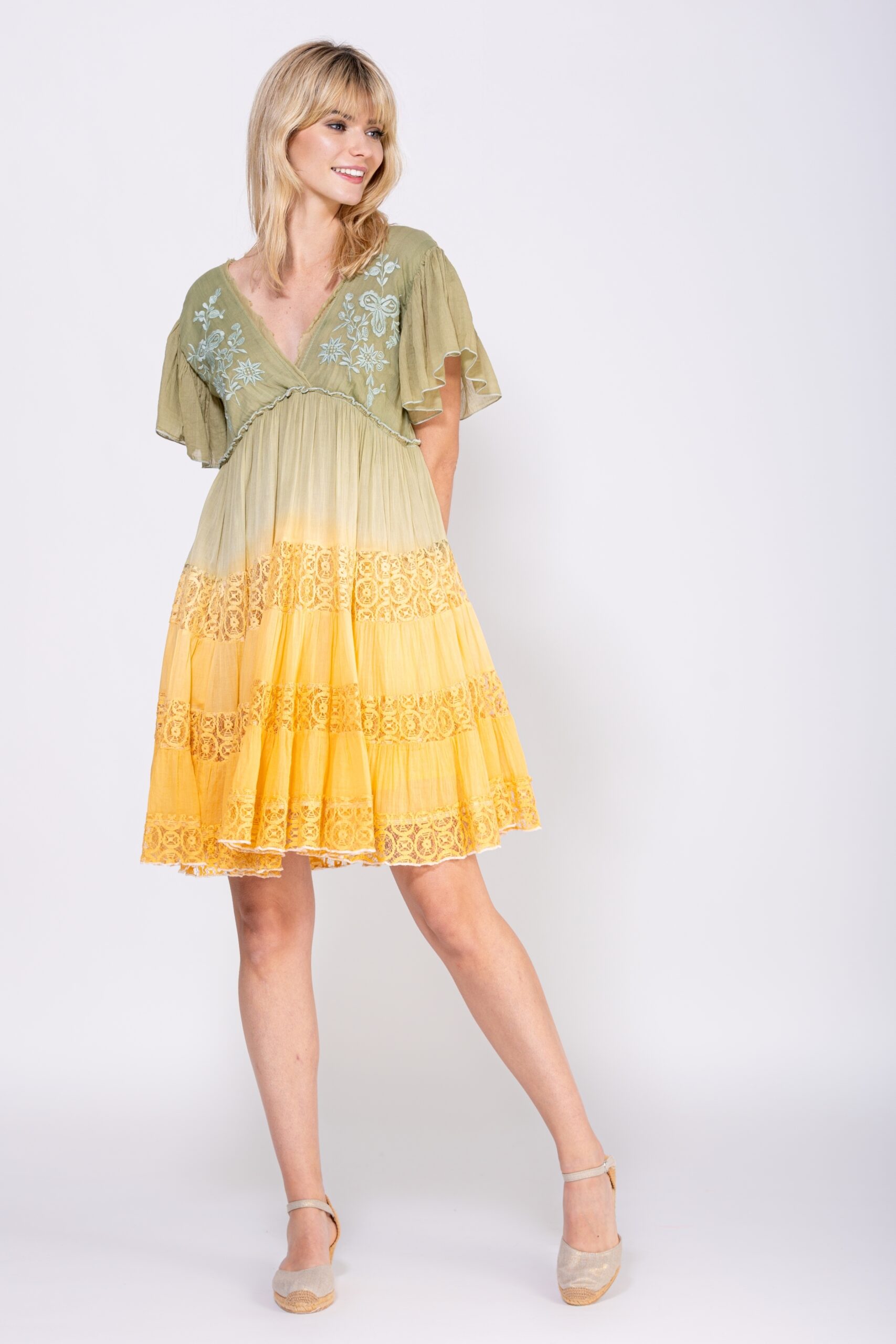 VESTIDO TYE DYE CON TIRAS DE ENCAJE CORTE EN EL PECHO BORDADO Y MANGAS DE VOLANTE